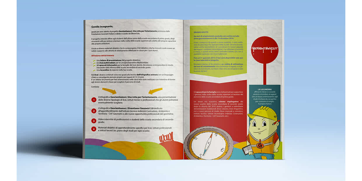 Georientiamoci, Memorie d'Italia, Generazione Chef, HED, and DRIN are editorial projects created by Ellesse Edu (now ScuolaAttiva). In these works, I designed handbooks for teachers, infographics, mascots, character designs, gadgets, and illustrations